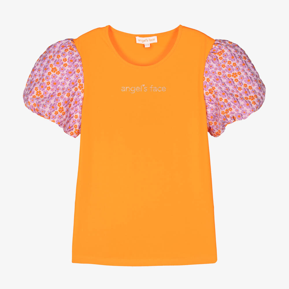 Vibrant orange T-shirt for teen girls by Angel's Face. Made in soft and stretchy cotton jersey, it has puff sleeves decorated with lilac purple floral jacquard for a stand-out look. Appliquéd to the front is a glittering diamanté logo, finishing this glamorous design.