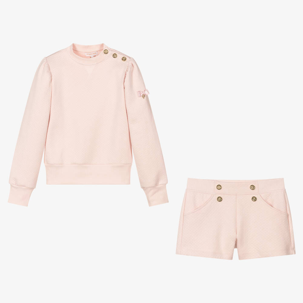 For a chic yet casual style, this pale pink shorts set for teen girls is from British brand, Angel's Face. In a diamond-quilted effect, the sweatshirt has a glam grosgrain bow on one sleeve, with the brand's beautiful heart charm and bow appliqué. It has puff sleeves, with eye-catching gold logo button fastenings on the shoulder. The shorts are adorned with gold buttons, slant pockets and an elasticated waist for effortless coordination.
