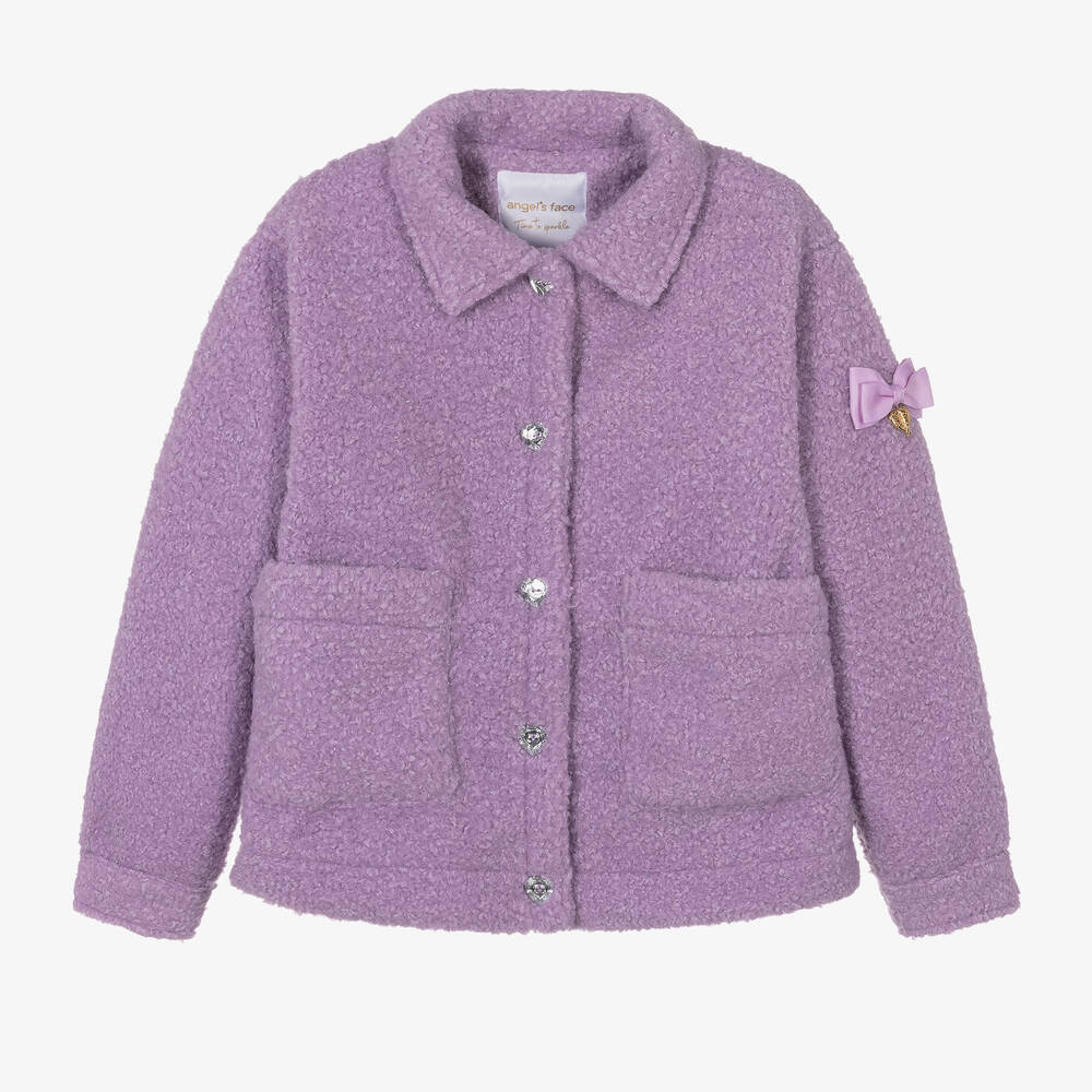 Gorgeous lilac purple, teddy fleece jacket for teen girls by Angel's Face. Beautifully soft, it is lined in lightweight satin for comfort and has the brand's signature heart charm and bow on one sleeve. It fastens on the front and cuffs with sparkling silver jewelled buttons for a glamorous touch, with useful patch pockets completing the stylish look.