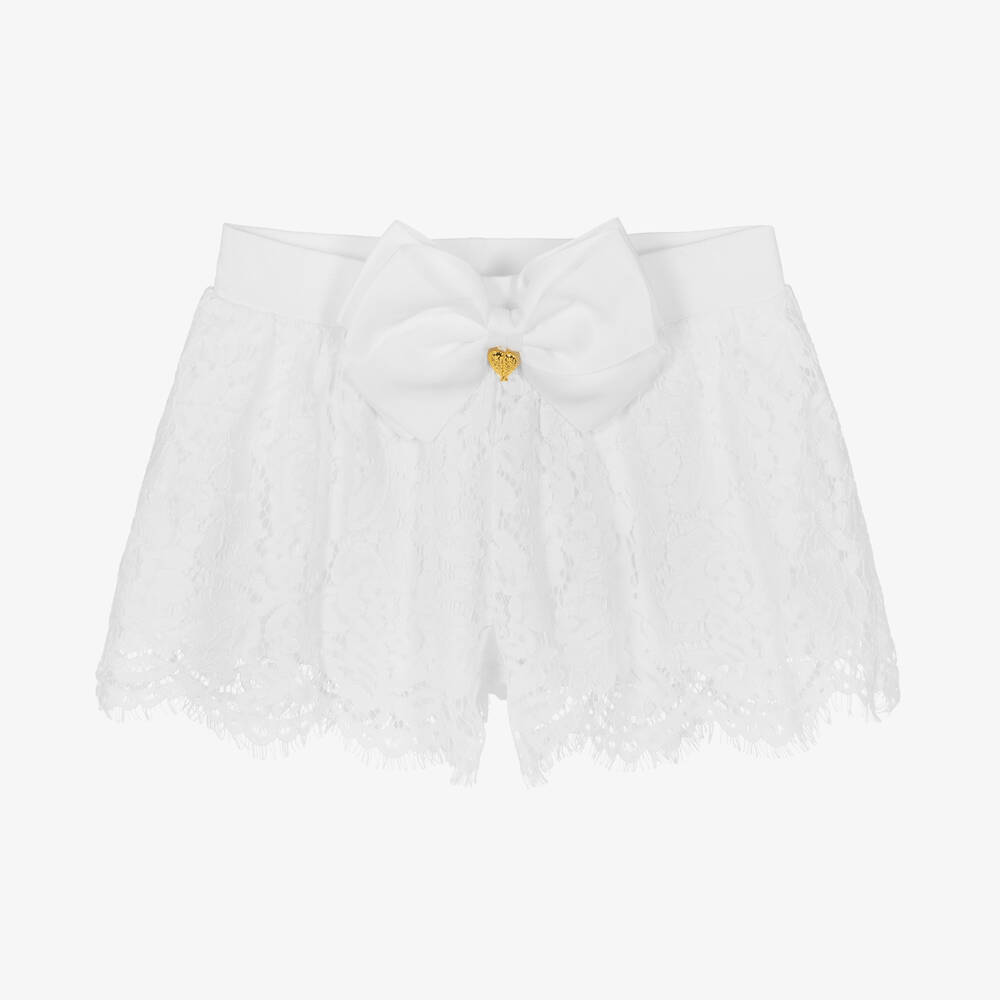 Chic off-white lace shorts for teen girls by British brand Angel's Face. A statement bow and gold heart charm, the signature of the brand, is attached on the front of the elasticated waistband. They are elegant for smart occasions and can be dressed down with casual pieces. The beautiful cotton lace has scalloped, eyelash trims on the hemline and they are fully lined in soft jersey for comfort.