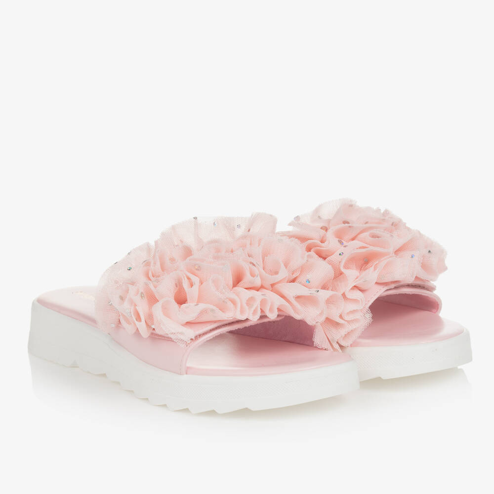 Stunning pale pink sliders for teen girls by British brand Angel's Face. Decorated with beautiful tulle ruffles and iridescent polka dots, they are easy to slip on for an effortlessly eye-catching resort look or to accessorise a casual style with a feminine touch. The strap has a padded soft fabric lining and adjustable velcro fastening for a good fit. They have gently padded, pink faux leather insole and chunky white non-slip rubber outsole.