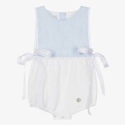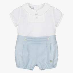 A traditional ivory shorts set for baby boys from Artesanía Granlei, made in a smart cotton-blend fabric. The long-sleeved collarless shirt has delicate pintuck detailing and mother-of-pearl buttons. The coordinating shorts have a lovely textured pattern and an elasticated waist and leg openings for comfort. Both pieces attach together with buttons for a neat, tucked-in finish.