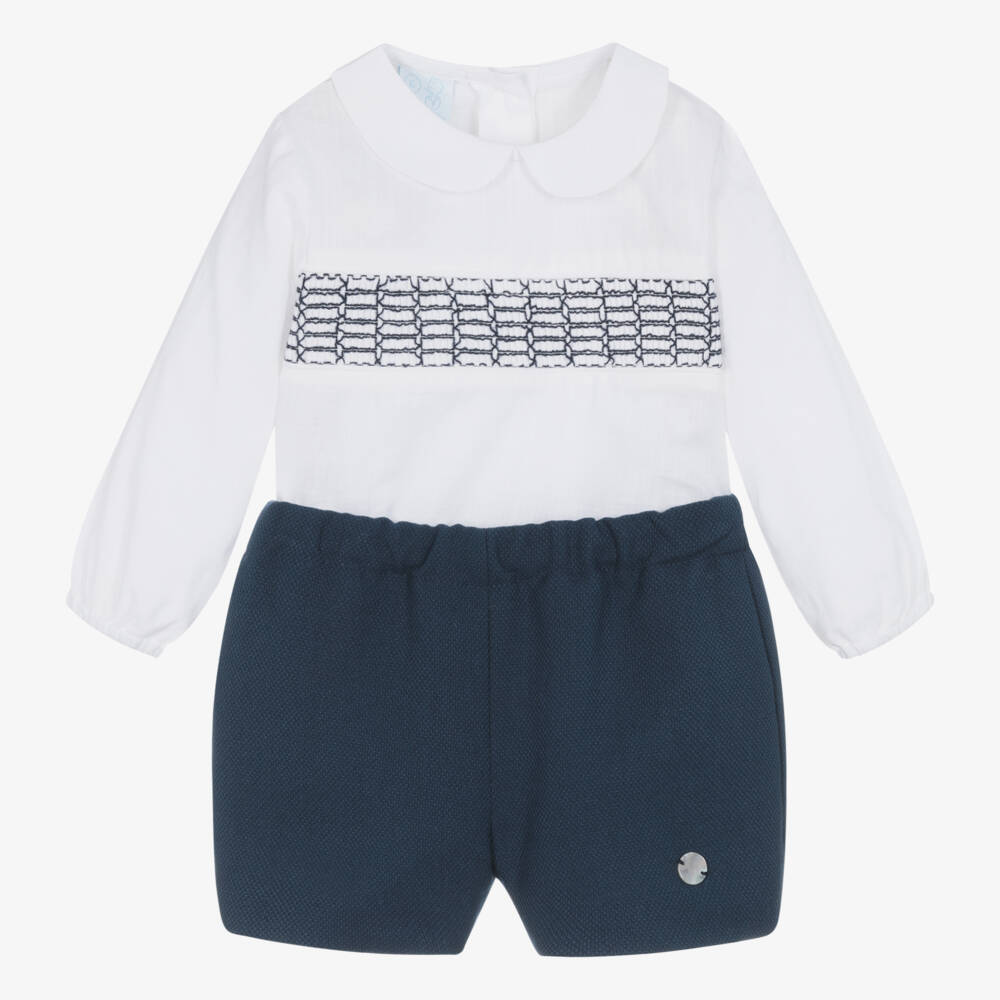 A classically styled white shirt and navy blue shorts set for baby boys by Artesanía Granlei. Made from organic cotton, the lightweight shirt has a sweet Peter Pan collar and a delicate smocked panel on the front. The coordinating shorts are fully lined and have an adjustable waist to ensure room for growth. Both items are finished with the brand's signature mother-of-pearl logo charm.