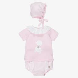 Exclusive to Childrensalon, this delightful burgundy red shorts set for baby girls is by Artesanía Granlei. The lightweight muslin blouse is woven in soft organic cotton with a sweet ruffle collar, and the pretty floral-patterned cotton shorts have frilly trims and cute bows at the sides. The coordinating cardigan is softly knitted with scalloped edges, and all pieces are finished with a mother-of-pearl branded charm.