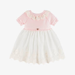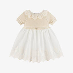 In sparkly gold and ivory, this pretty dress for baby girls is by Artesanía Granlei. A charming blend of textures, it has a delicate lace collar, a soft knit lurex bodice, and a sheer tulle skirt with beautiful floral embroidery and a scalloped hem. Fastening with small buttons on the back, the dress has a smooth lining under the skirt, with a branded mother-of-pearl charm on the front adding a signature finish.