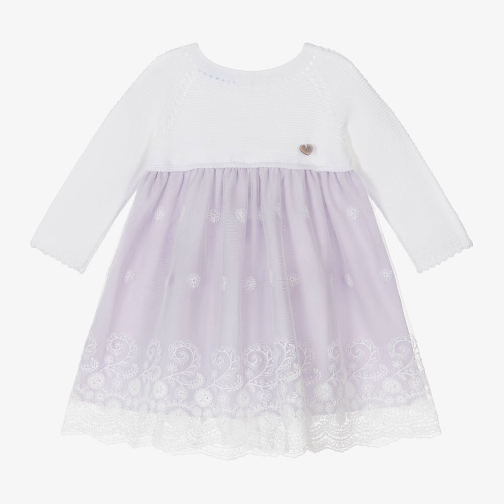 A gorgeous white and lilac purple dress for baby girls from Spanish brand, Artesanía Granlei. The pretty bodice is made in a soft cotton blend knit with scalloped cuffs on the long sleeves and a faux mother-of-pearl logo charm on the chest. Lined in lilac purple cotton, the white tulle skirt has a beautifully embroidered flower pattern and border around the hem. It fastens with buttons on the back.