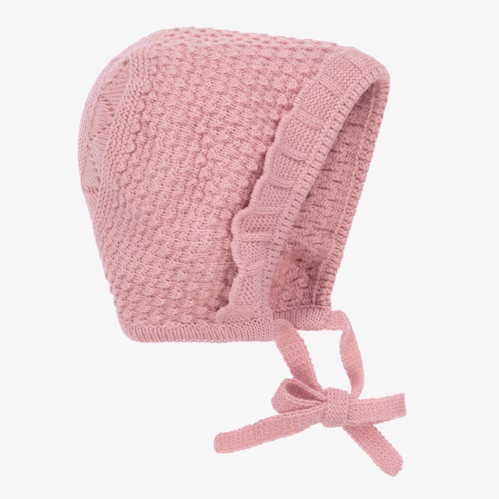A lovely pink knitted bonnet for baby girls by Spanish brand Artesanía Granlei. Patterned for texture, it has a sweet scalloped trim on the front, a delicate sunflower design on the crown, and a signature pearlised charm on one side. It easily ties underneath the chin for a secure fit.