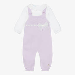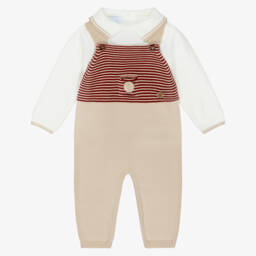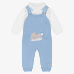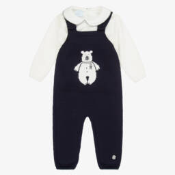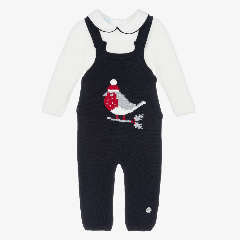 Exclusive to Childrensalon, an adorable knitted navy blue dungaree set for little boys by Spanish brand Artesania Granlei. The ivory sweater has a twill Peter Pan collar with navy blue piping, cosy ribbed trims and button fastenings on the back. The navy blue dungarees have a festive robin intarsia on the front in red, grey and ivory, with a sweet pom-pom, and button-fastening shoulder straps. Both pieces have the designer's mother-of-pearl logo charms sewn on one side.