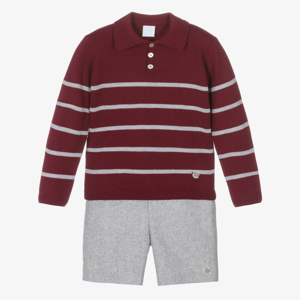 Smart-casual short set for boys by Artesanía Granlei. Patterned in grey stripes, the red knitted jumper has a smart pointed collar, cosy ribbed trims and it fastens on the front with pearlescent buttons. The co-ordinated wool-blend shorts, have smart pleats on the front for a tailored look. Button and zip fastening, they have two slanted front pockets and the elasticated, adjustable waist allows for a secure and comfortable fit.