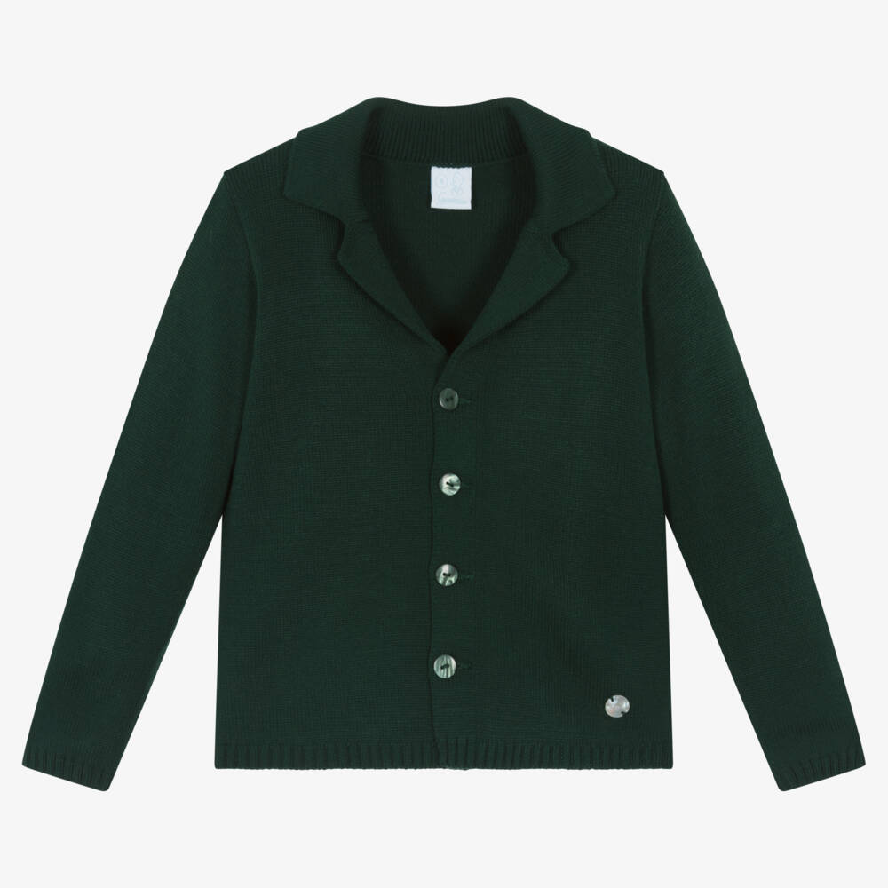 Dark green knitted cardigan for boys by Spanish brand Artesania Granlei, exclusive to Childrensalon. Soft and lightweight, it has a revere collar, neat, ribbed trims and is ideal as an extra layer on cooler days. It fastens with green buttons on the front and has a mother-of-pearl logo charm sewn by the hemline.