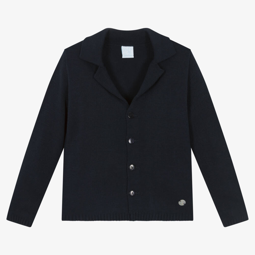Navy blue knitted cardigan for boys by Spanish brand Artesania Granlei, exclusive to Childrensalon. Soft and lightweight, it has a revere collar, neat, ribbed trims and is ideal as an extra layer on cooler days. It fastens with navy blue buttons on the front and has a mother-of-pearl logo charm sewn by the hemline.
