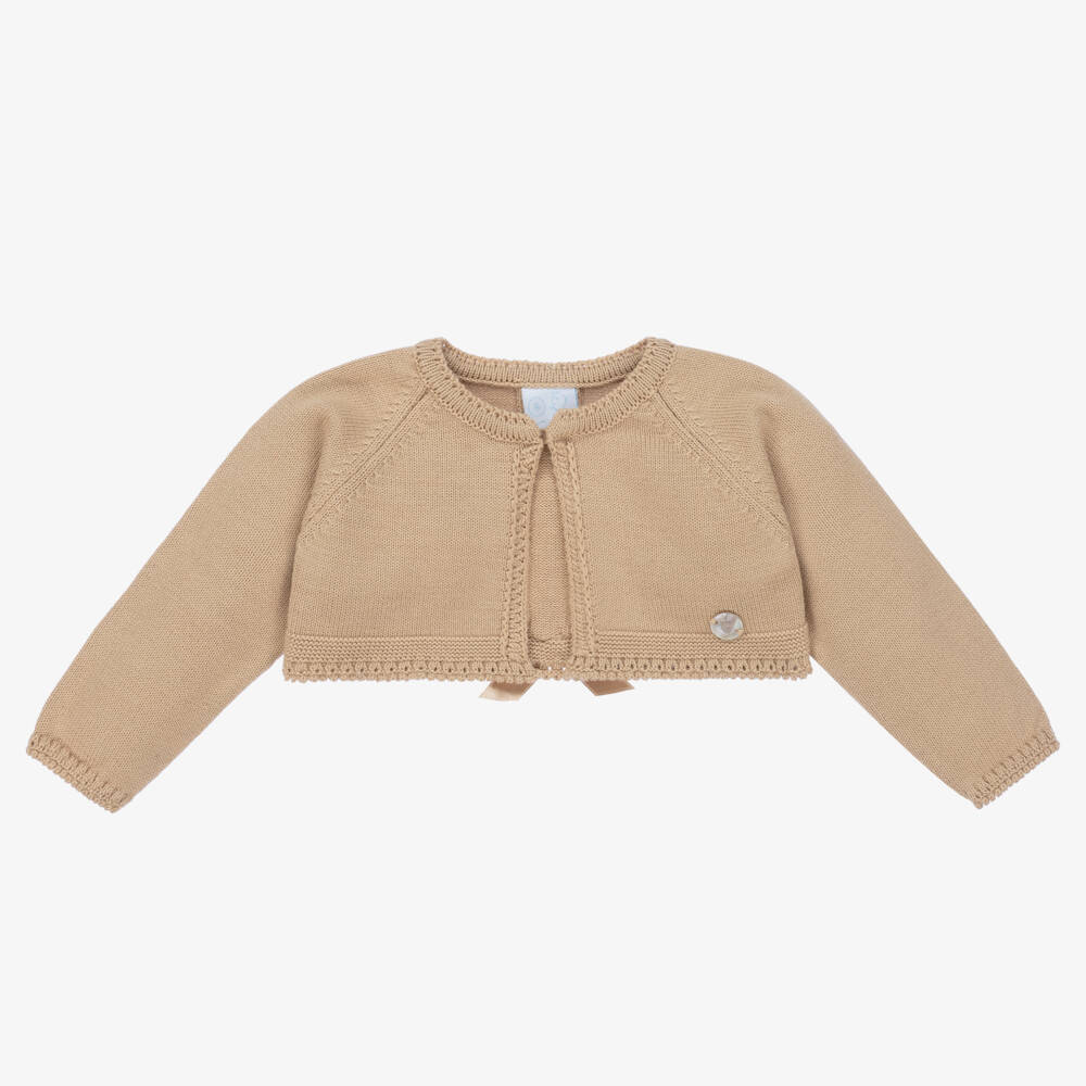 Elegant and classical beige bolero cardigan for little girls by Spanish brand Artesania Granlei, knitted in the softest cotton blend. It has a crocheted panel and shiny satin ribbon interwoven on the back, with a bow appliqué for a pretty finishing touch.