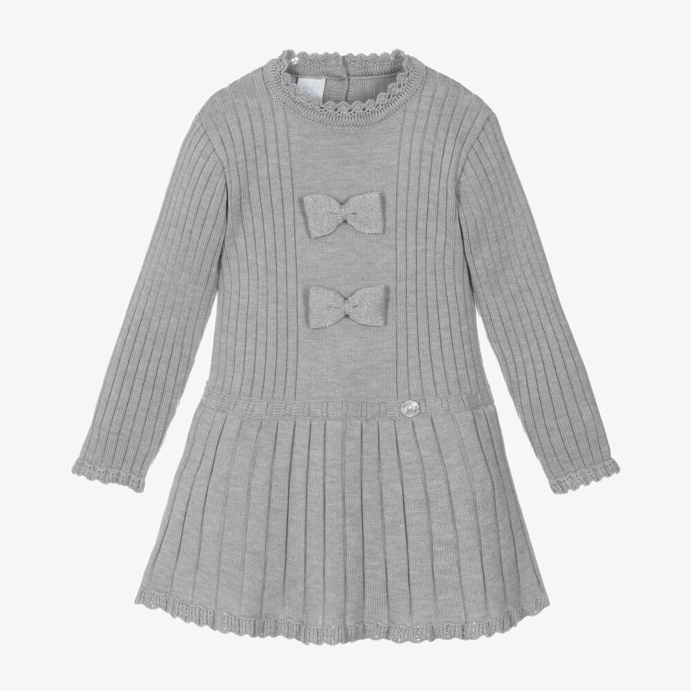 Exclusive to Childrensalon, a smart-casual pale grey marl dress for girls by Spanish brand Artesania Granlei. Made in a soft, ribbed knit with scalloped trims, it has fixed glittery silver bows on the front. The matching glittery waistband has a round, mother-of-pearl logo tab sewn on one side. It has little button fastenings around the back and a poplin lining on the skirt for a little volume.