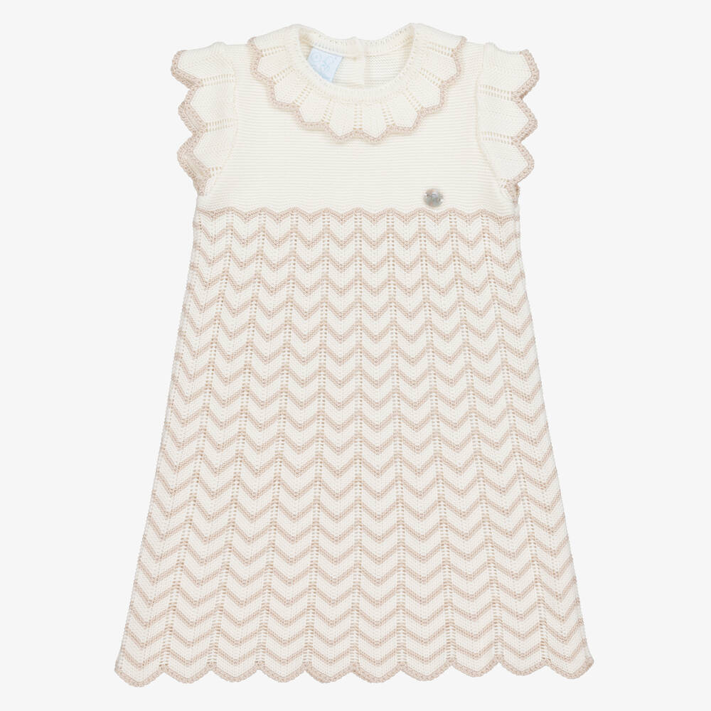 Sweet ivory dress for girls by classic brand Artesanía Granlei, with scalloped trims and beige zigzags. It is knitted in a soft cotton blend, with capped sleeves.