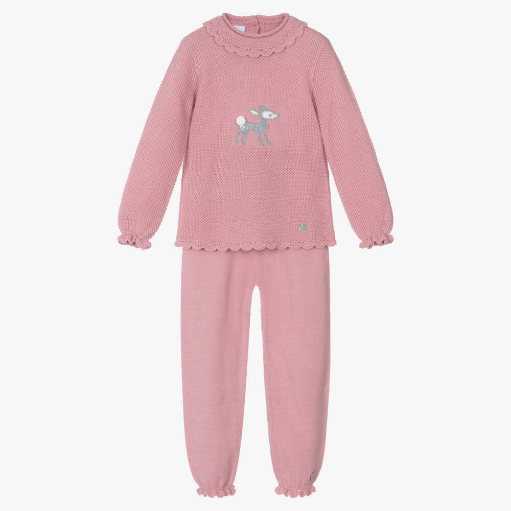Exclusive to Childrensalon, pretty pink knitted trouser set for girls by Spanish brand Artesania Granlei. Beautifully soft for comfort, the top has feminine scallop detailing and a cute intarsia Bambi knit on the front. Button fastenings on the back add to the classic look. The matching trousers have an elasticated waist which can be adjusted with growth for a better fit.