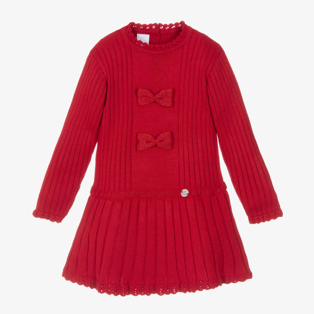Exclusive to Childrensalon, a smart-casual red dress for girls by Spanish brand Artesania Granlei. Made in a soft, ribbed knit with scalloped trims, it has fixed glittery silver bows on the front. The matching glittery waistband has a round, mother-of-pearl logo tab sewn on one side. It has little button fastenings around the back and a poplin lining on the skirt for a little volume.