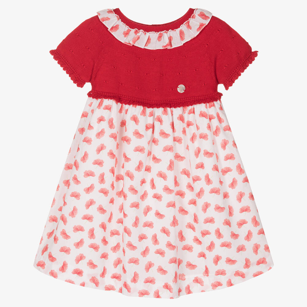A lovely classically styled dress for little girls, by Spanish brand Artesania Granlei. The red bodice is finely knitted in a soft cotton blend and has pretty scalloped trims. The white skirt and ruffle collar are woven in lightweight cotton and patterned in a beautiful red floral print. Fastening with buttons on the back, this sweet dress has a lightweight lining under the skirt for added comfort.