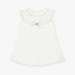 A lovely ivory knitted nest for baby girls by Artesanía Granlei. Cosy and warm, this lightly padded nest has a soft linen blend lining, patterned with a beautiful orange floral print and trimmed with a pretty ruffle. It fastens around the sides with a zip, allowing it to be opened and laid flat providing a comfortable area for changing or playing.