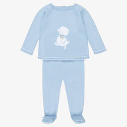 Очаровательный кремовый трикотажный комбинезон от Artesanía Granlei. Милый топ с нежными синими деталями, волнистыми краями и застежками на пуговицах сзади. Подходящие штанишки с мягкой резинкой на талии и милыми бантиками на закрытых ножках.