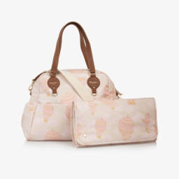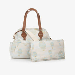 Pale blue and gold jacquard changing bag by Atelier Choux Paris, patterned in the brand's signature hot air balloons. This elegant bag is lined soft canvas, with plenty of pouches and pockets, including an internal insulated bottle holder. It has fixed carry handles and comes with a detachable adjustable strap and a useful changing mat. Branded brown leather trims and a gold tone zip fastening add a luxurious finish.