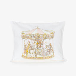This beautiful ivory pillow for baby boys and girls by Atelier Choux Paris will add an elegant touch to any nursery. Beautifully made in soft, organic cotton sateen, the removable cover has an enchanting carousel design printed on the front in pastel shades of blue and yellow. A pink logo is printed around the back, with sweet carousel animals.