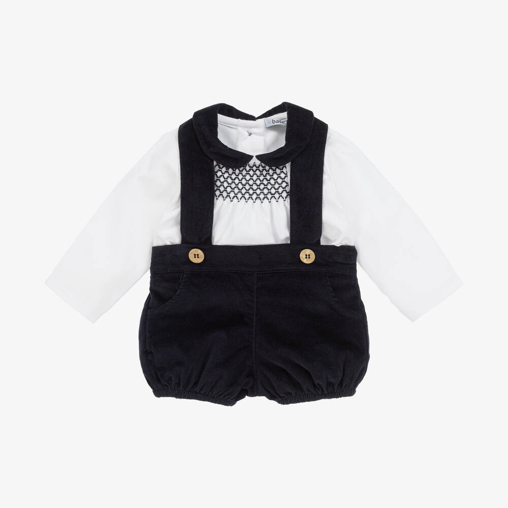Cotton shorts set for baby boys by Babidu, in navy blue and white. Smart and classic, the soft twill shirt has a smocked-style shirred panel on the chest and natural button fastenings on the back. The velvet shorts have matching buttons on the shoulder straps, an elasticated panel on the back of the waist, and little front pockets.