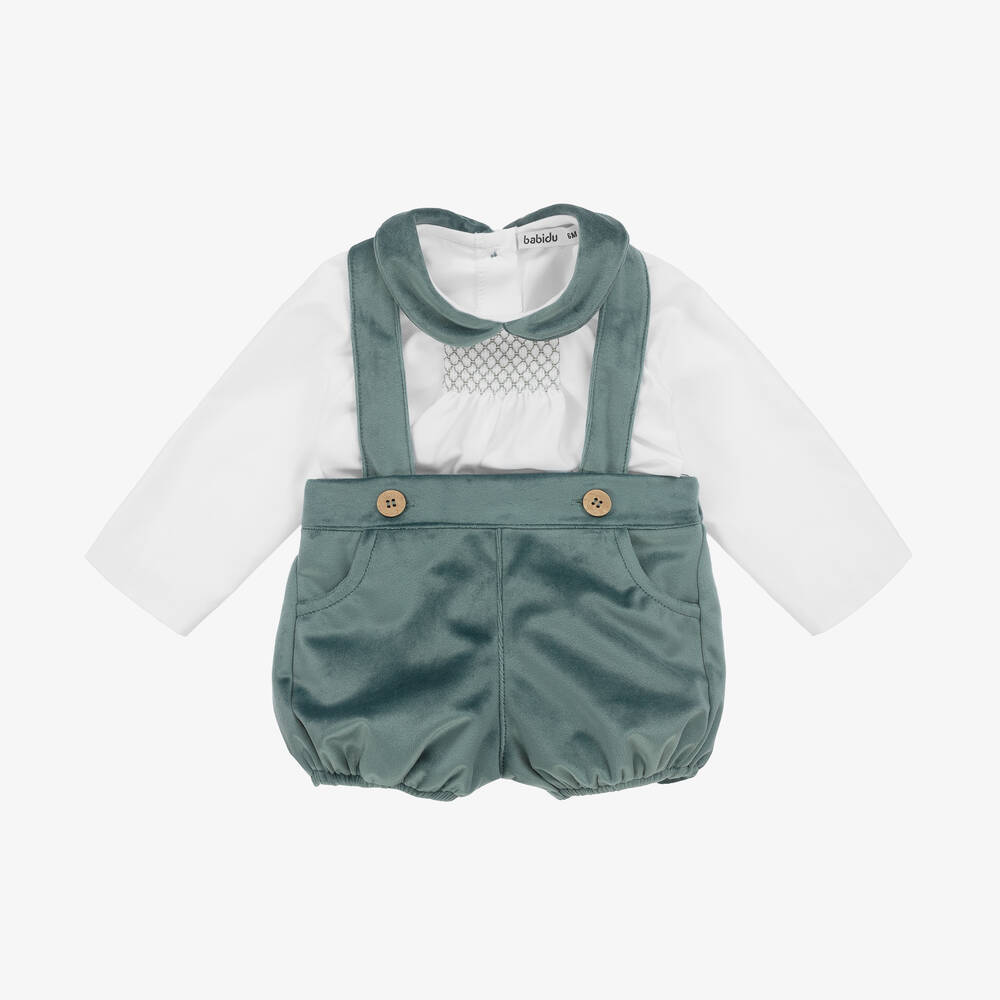 Cotton shorts set for baby boys by Babidu, in green and white. Smart and classic, the soft twill shirt has a smocked-style shirred panel on the chest and natural button fastenings on the back. The velvet shorts have matching buttons on the shoulder straps, an elasticated panel on the back of the waist, and little front pockets.