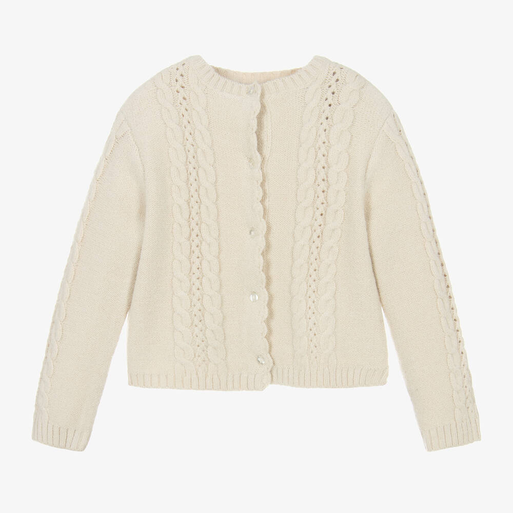 A charming beige cardigan for boys and girls by Babidu. Knitted with a touch of wool for cosy comfort, this classic layering piece has cable knit details and beautiful openwork designs. It fastens with neat buttons on the scalloped placket.