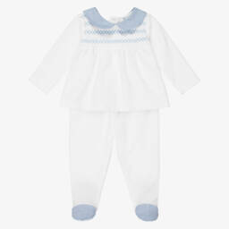 Lovely white and beige two piece babygrow for little boys and girls by Babidu, made in soft cotton jersey. The button-fastening top half has a cute rounded collar and sweet farmhouse and orchard print. Matching bottoms complete the neutral look.