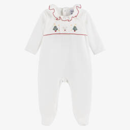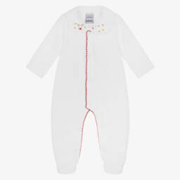 Classic beige babygrow for boys and girls by Spanish brand Babidu, made in cosy cotton-blend velour. It has a traditional rounded collar and decorative buttons on the front. There are easy-to-use poppers on back and between the legs to help with easy dressing and changing.