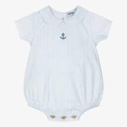 In a charming blue, beige and mauve check pattern, this cute shortie for baby boys and girls is by Babidu. Made in soft and lightweight twill, it has a sweet Peter Pan collar delicately embroidered to match the bib panel. It is cotton-lined and has natural button fastenings on the back and between the legs for a traditional finish.
