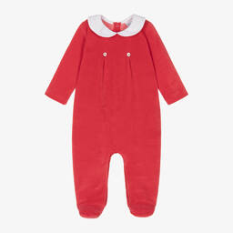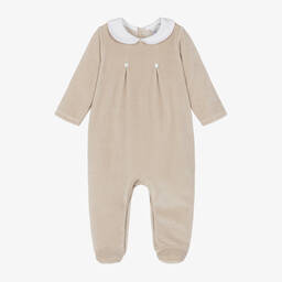 Classic navy blue babygrow for boys and girls by Spanish brand Babidu, made in cosy cotton-blend velour. It has a traditional rounded collar and decorative buttons on the front. There are easy-to-use poppers on back and between the legs to help with dressing and changing.