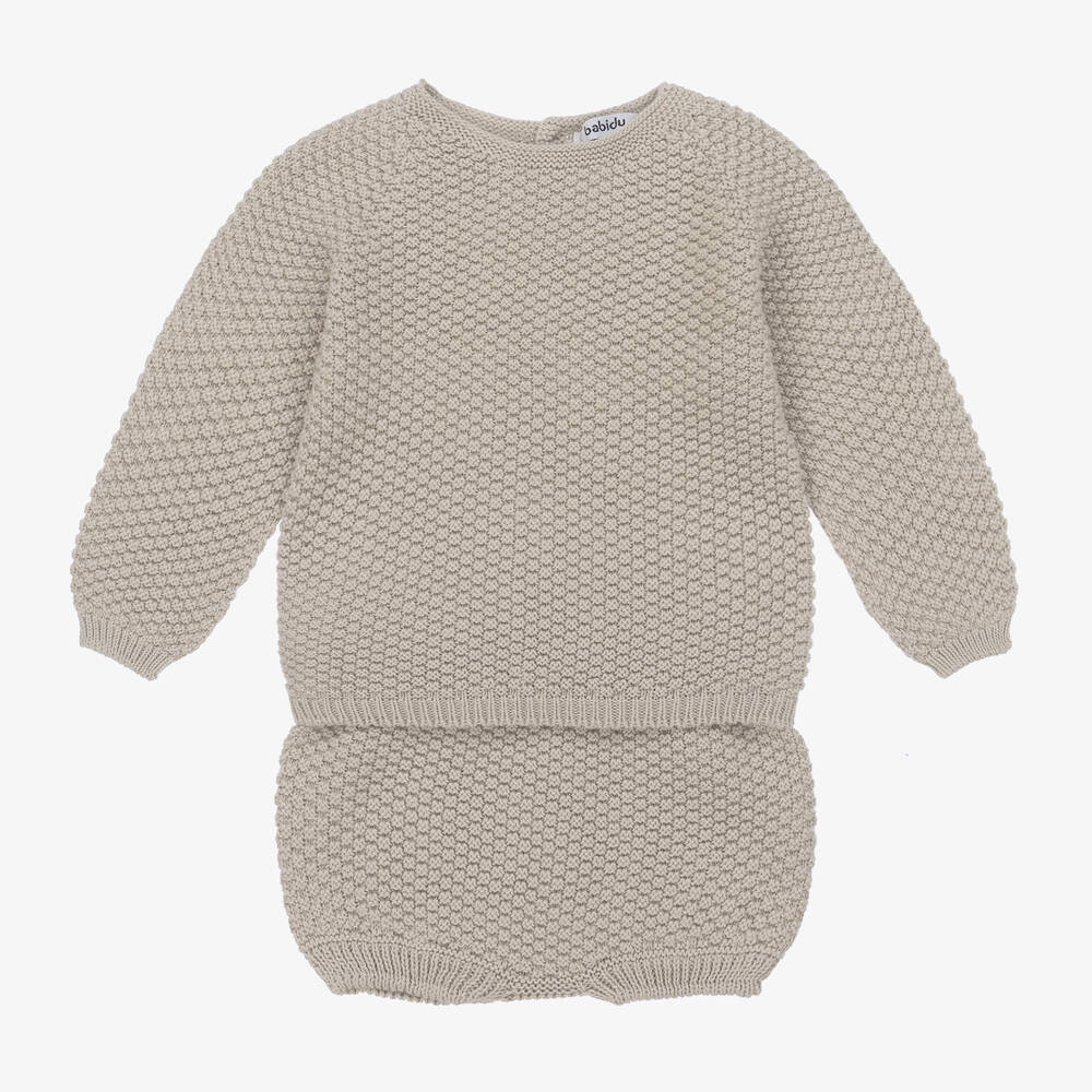 Sweet beige cotton shorts set for little boys by Spanish brand Babidu. Soft and comfortable to wear, it is knitted in a pretty, textured moss stitch and has neat, ribbed trims. The sweater fastens on the back with little white buttons, and the shorts are easy to wear, simply pulling up.