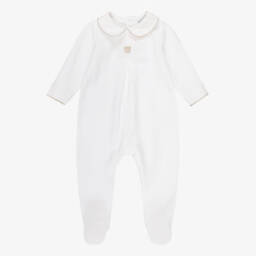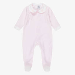 Light blue babygrow for boys by Babidu, knitted with cotton for softness against delicate skin. This lovely one-piece has a white Peter Pan collar and smocked detailing on the chest. It has cosy, enclosed feet and easy popper fastenings to help with changing.