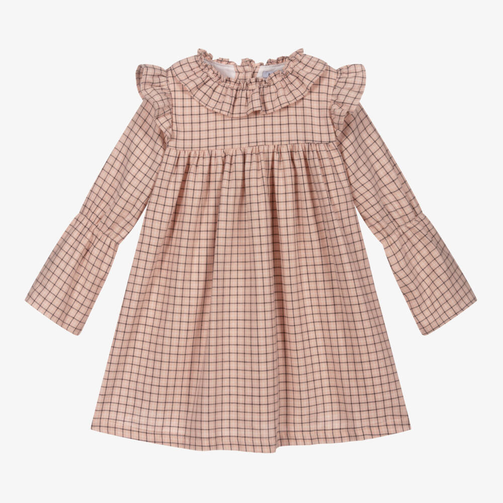Girls pale pink dress by Babidu, made in a soft cotton flannel. The dress has a navy blue check pattern with ruffles over the shoulders and the neck. It is lined in lightweight cotton and fastens with wooden buttons on the back.
