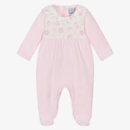 This white cotton babygrow for girls by Babidu features a sweet floral pattern in shades of pink and blue. Made in soft, comfortable jersey, it has a pretty, ruffled green gingham collar and matching front pockets. Fastening with poppers on the front, it is easy to wear.