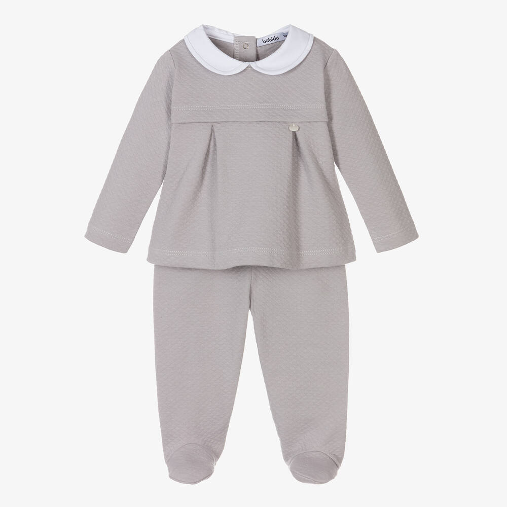 Adorable grey two-piece babygrow for boys by Babidu. Made in soft cotton waffle jersey, the top has a traditional rounded collar, and pleated detail on the front. It pairs with matching bottoms to complete the look.