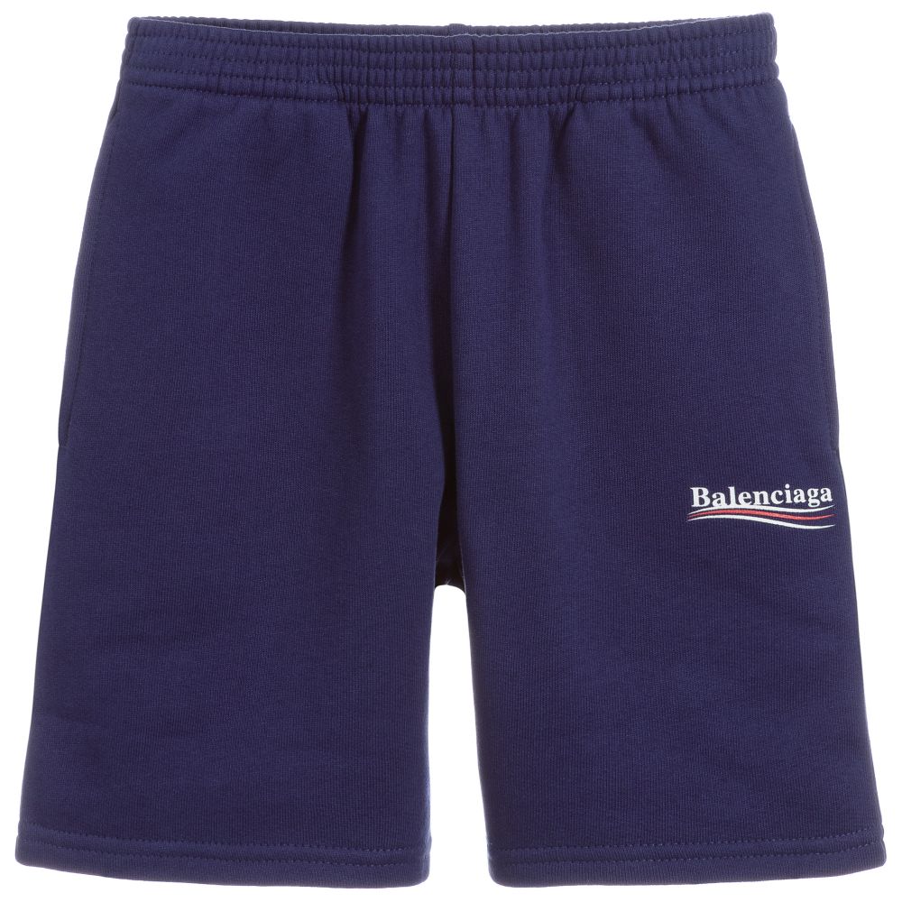 Comfortable mid-blue shorts for boys and girls by Balenciaga, with a red and white Political Campaign logo print. An oversized fit, they are made in mid-weight cotton sweatshirt jersey with a soft fleecy underside. They have useful side pockets and an elasticated waistband.