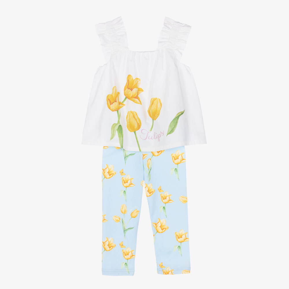 A lovely white and blue cotton leggings set for girls by Balloon Chic. Made in lightweight poplin, the pretty top has elasticated frilled shoulder straps and a yellow tulip motif on the front, with sparkling diamanté detailing. It fastens with a single button on the back. The blue full-length jersey leggings are patterned in a matching floral print incorporating the designer's logo for a signature finish.