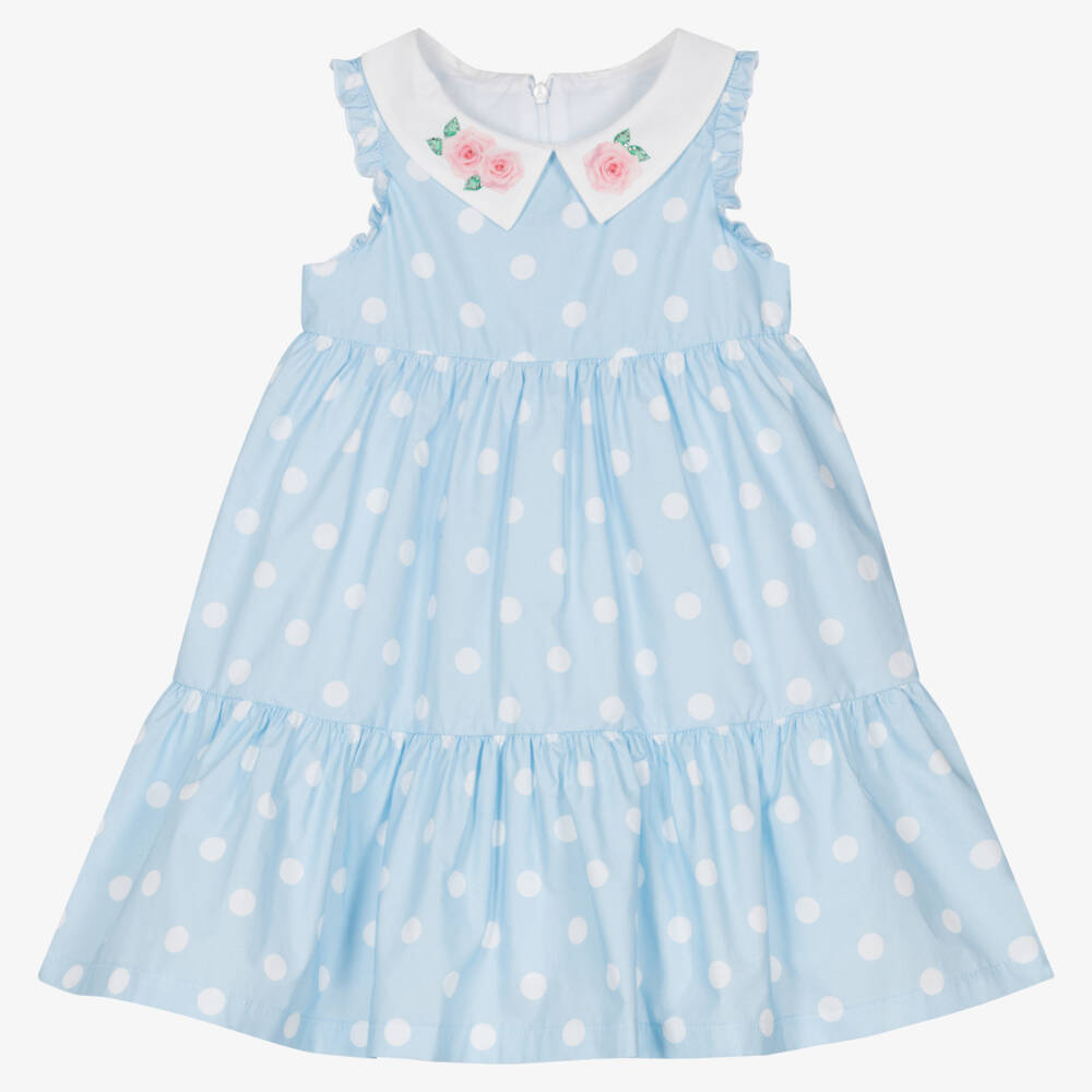 A light blue and white cotton polka dot tea dress for girls from Balloon Chic. Soft and lightweight, this comfortable dress is made in cotton poplin, with a breathable cotton voile lining. The white pointed collar is adorned with pink rose prints and diamanté studs. The sleeve openings are trimmed with ruffles and the skirt is tiered for a lovely silhouette. Easy to fasten, the dress features a hidden zip on the back for a seamless finish.