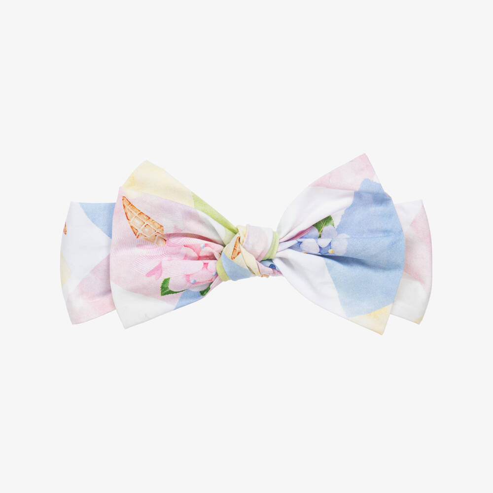 A sweet headband for girls from Balloon Chic, in pastel pink, green, blue and yellow. With a lovely bow on the front, this cute accessory is made in lightweight cotton and patterned with a floral ice cream print. The back is gently elasticated for comfort.