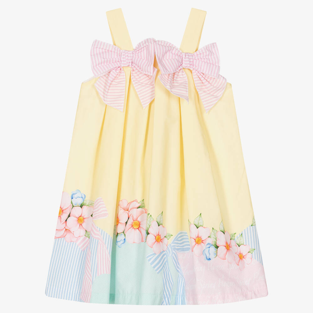 A pale yellow cotton dress for girls by Balloon Chic, made in soft and lightweight poplin. This strappy dress has gorgeous pastel-coloured patchwork-style motifs across the hem, with striped bows, flowers and nature-inspired lettering. It has darts on the front and back for shape and sweet pink stripy bows on the bodice. Easy to wear, a neat concealed zip fastens the dress on the back and the cotton lining is soft and breathable.