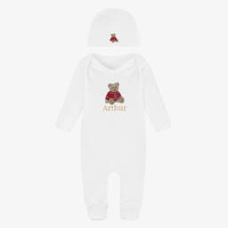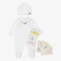Cute black and white babysuit set for girls by luxury designer, Balmain. It has a sweet ruffle collar, a gold Balmain Paris logo on the chest and shiny gold medallion faux pockets. There are poppers on the back and between the legs for easy dressing. A white layette hat completes the lovely set, ideal for gifting.