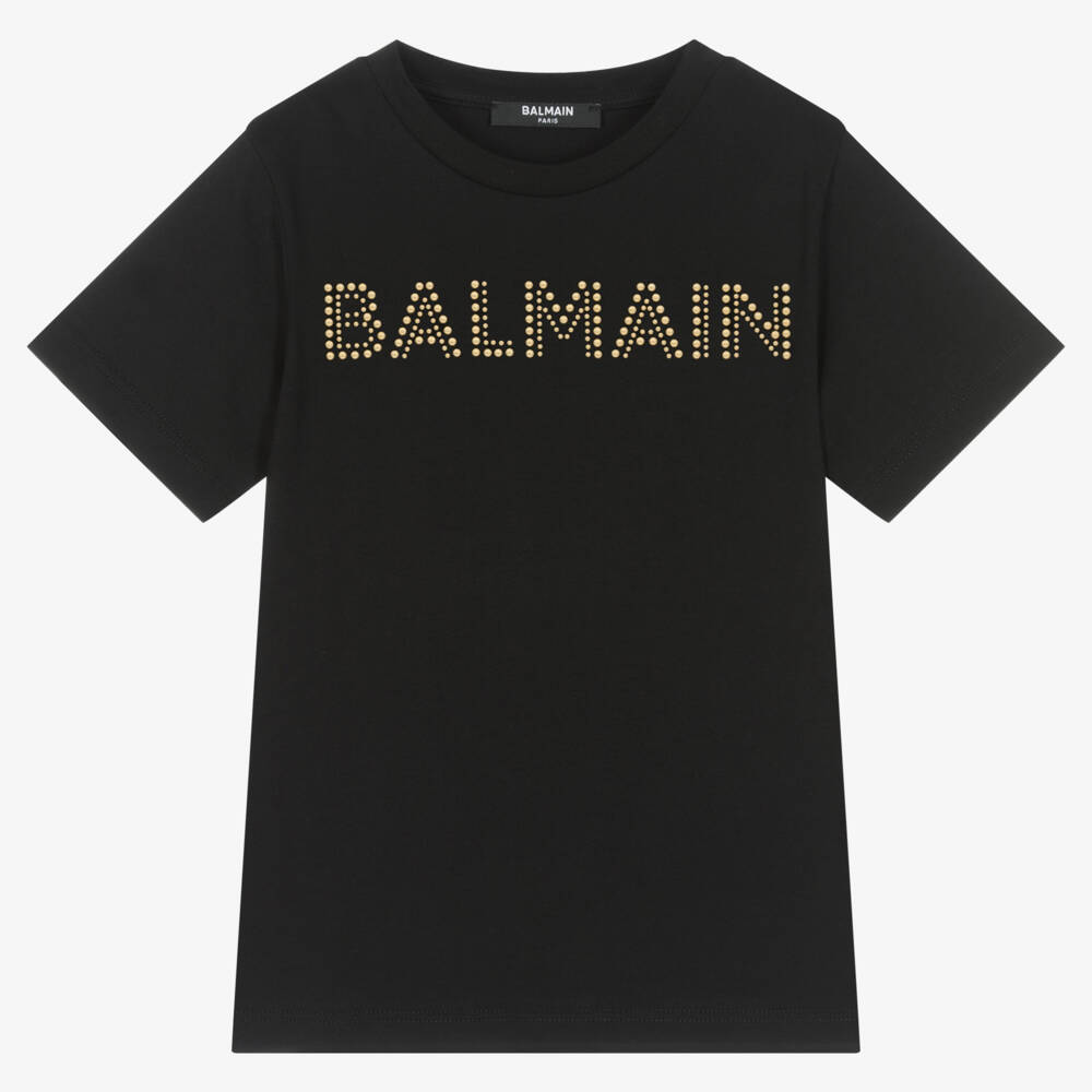 A black T-shirt for girls by luxury French brand Balmain, made from super soft cotton jersey. A gold studded logo on the front of this casual tee for a statement look.