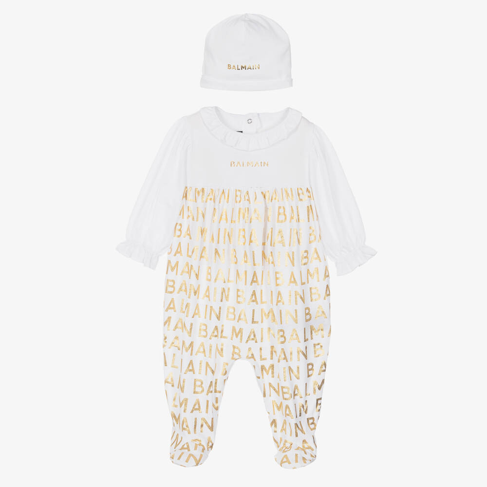 A lovely white babysuit and hat set for girls by luxury French brand Balmain. For an unmistakable designer look, the babygrow has an all-over metallic gold logo print, with a matching logo on the hat. The babysuit has pretty ruffle trims and the hat has a sweet turned up brim. To make dressing easy, the babygrow fastens with poppers on the back and between the legs. Presented in a branded gift box, the set makes a lovely present for a new arrival.