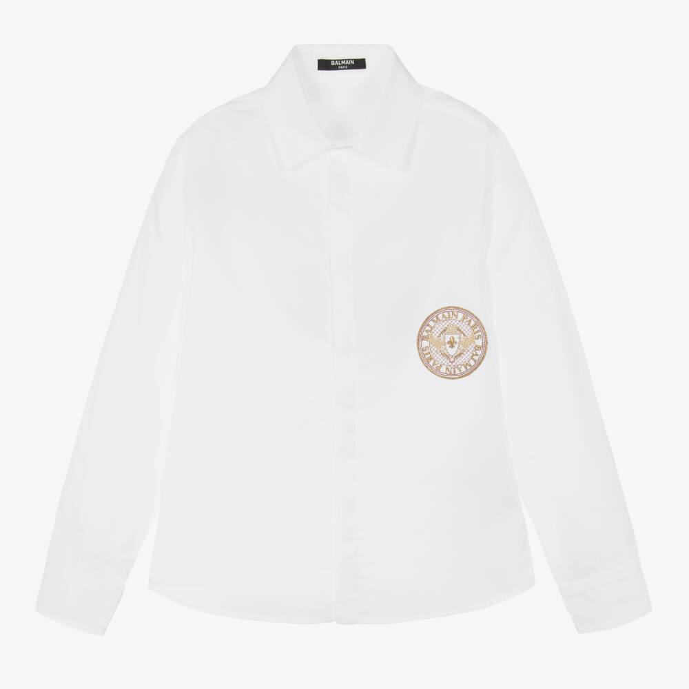Smart white cotton poplin shirt for teen boys by French brand Balmain. Reflecting the luxury brand's opulence, the medallion logo is embroidered in shimmery gold on one side. This comfortable fitted style has buttoned cuffs and a hidden front button placket for a neat finish.