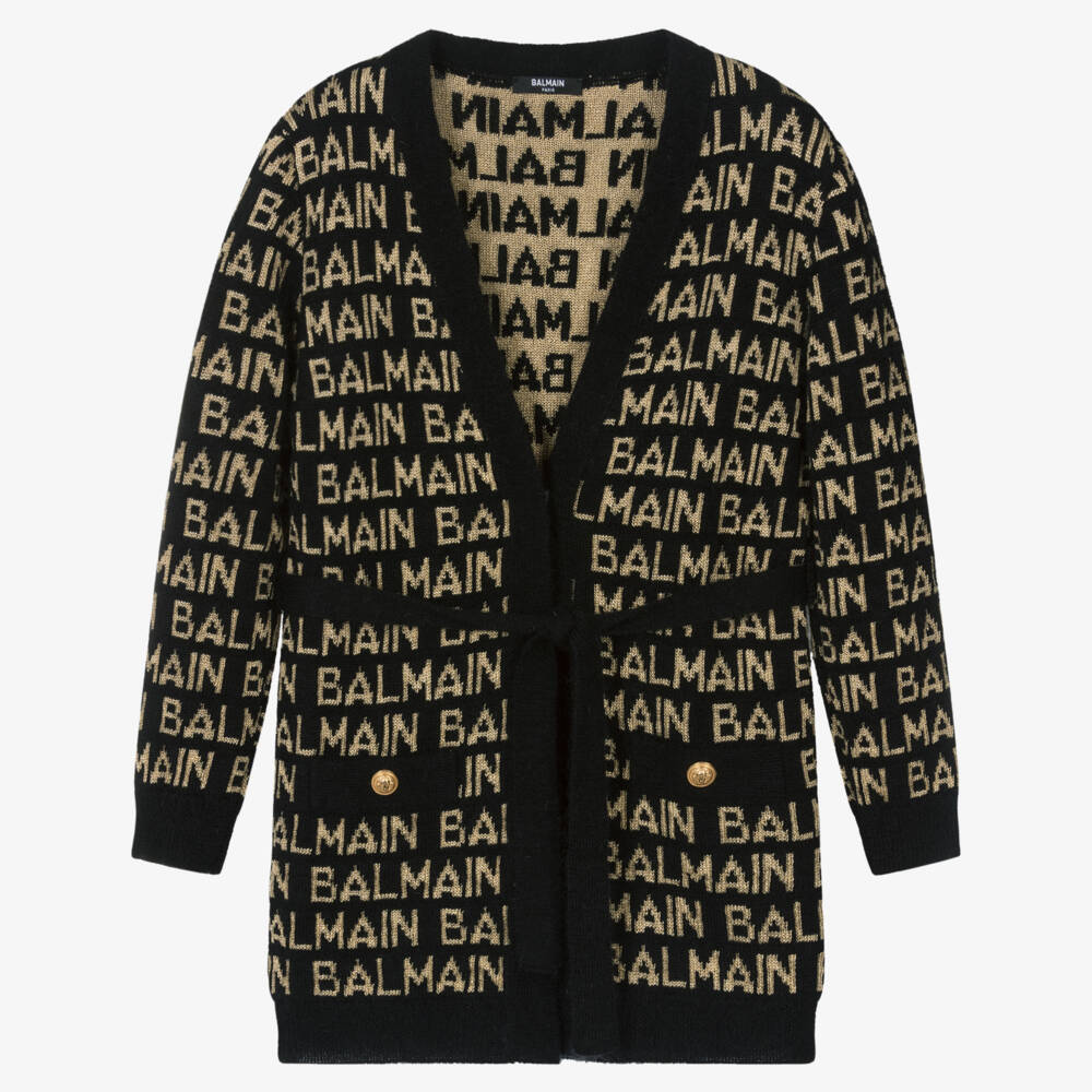 Teen Girls black and gold cardigan by French designer Balmain, beautifully knitted in a luxuriously soft wool and cashmere blend. Patterned with a statement logo design, this longer style cardigan has lightly ribbed knitted trims and front faux pockets. These are trimmed with gold lion crest buttons, truly reflective of this iconic brand.
