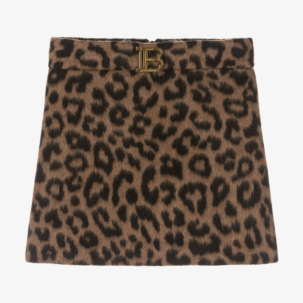 Brown and black mini skirt for teen girls by French fashion house Balmain, made in softly brushed wool-blend fabric. Patterned with leopard print for a striking look, this stylish piece is signed with a luxe gold-tone metal monogram logo feature on the waist. Fully lined with silky jacquard viscose, it has a statement zip fastening on the back in complementary gold.