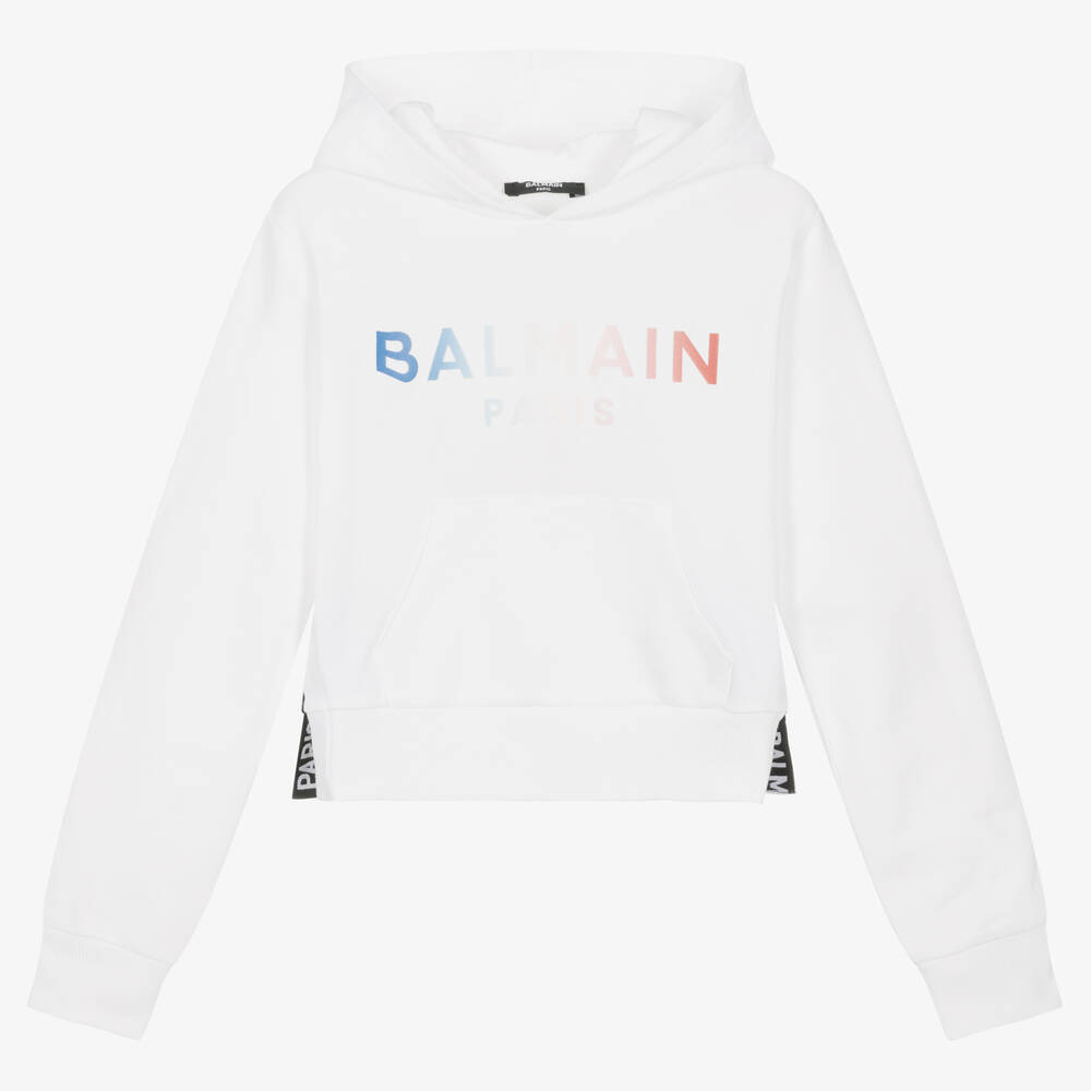 Teen girls casual white cotton hoodie by French luxury brand Balmain, with their iconic Balmain Paris logo on the front in pink and blue ombré. Made in soft cotton sweatshirt jersey this cool top also has sporty monochrome logo taping on the split seam.