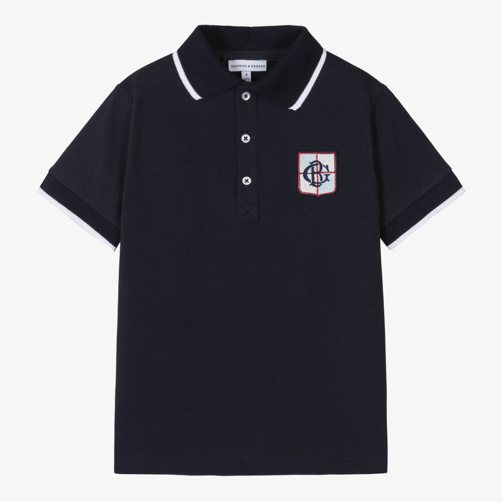 Exclusive to Childrensalon, a navy blue cotton polo shirt for boys by classic British brand Beatrice & George, with an embroidered, monogram logo crest badge on the chest in blue, red and white. It is made in comfortable, stretchy piqué, with ribbed trims on the short sleeves, tipped in red and navy blue. It fastens with branded buttons on the front.